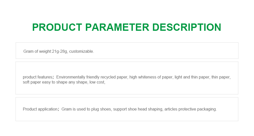 Features:Environmentally friendly recycled paper, with a high whiteness on the paper surface, is light and thin. It is a type of paper that is soft and easy to shape in any shape, with low cost.