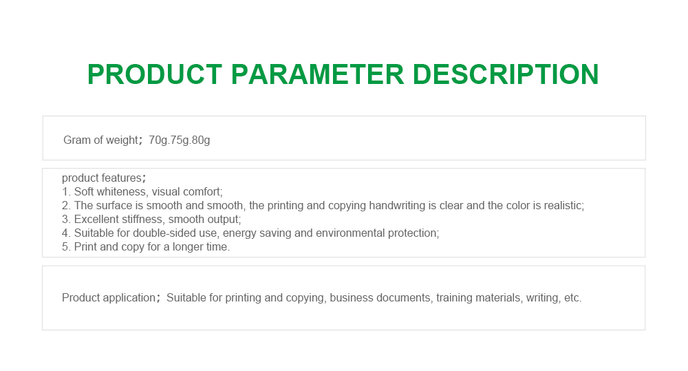Features:① Good quantitative and thickness uniformity, high stiffness and loose thickness, and good die-cutting box forming performance;