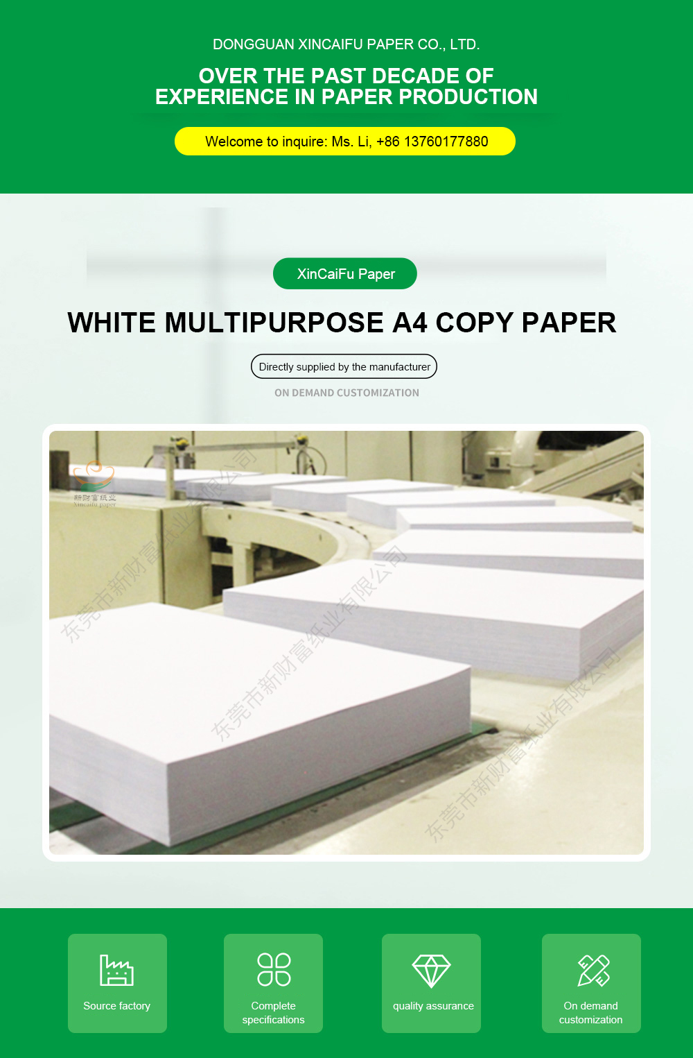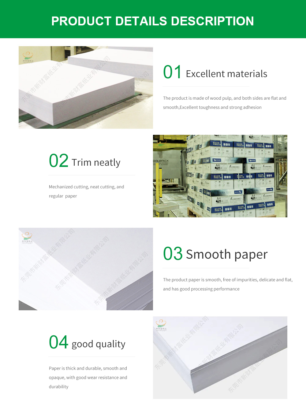 Weight range:70g.75g.80g Features:1. Soft whiteness, visually comfortable; Product application:Suitable for printing and copying, business documents, training materials, writing, etc. |
