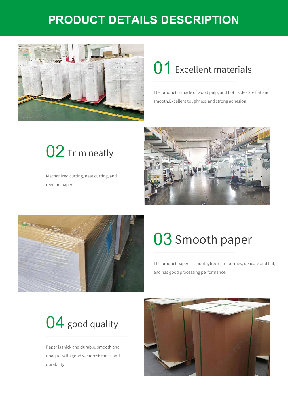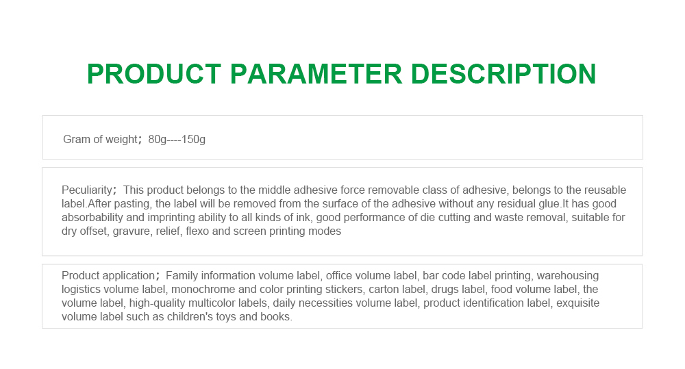 Weight range:80g---150g Features:Ordinary adhesive environmentally friendly water-based adhesive system, free from high concern substances such as alkyl phenols. It has good absorption and inking properties for various types of ink, good die-cutting and waste removal performance, and is suitable for various printing modes such as dry offset, gravure, relief, flexographic, and screen printing; Suitable for processing roll type adhesive labels. Product application:Home information labels, office labels, barcode printing labels, warehousing logistics labels, single and multi-color color printing stickers, cardboard labels, drug labels, food labels, experimental labels, high-quality multi-color labels, daily necessities labels, product identification labels, exquisite children's toys and book labels, etc. |